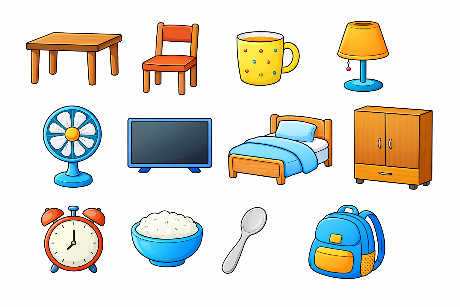 Đồ vật trong gia đình là những thứ bé nhìn thấy mỗi ngày. Việc tập tô màu các đồ vật quen thuộc sẽ giúp bé dễ ghi nhớ, nhận biết và gọi tên mọi thứ xung quanh một cách tự nhiên.